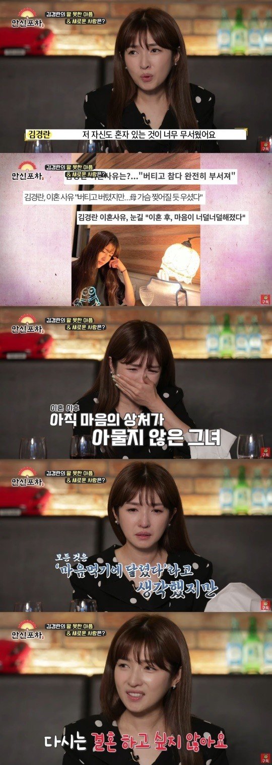 김경란은 혼자 있는 것에 대한 불안감을 드러내며 "분리된 방이 싫어서 원룸에서 생활했다. 저 너머에 뭐가 있는 것 같은 느낌이 들더라. 그것에 대한 불안증이 너무 심했다"고 이혼 후 삶에 대해 힘들었음을 고백했다.