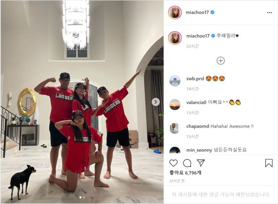 아내 하원미 씨는 19일(현지시간) 자신의 인스타그램에 "추 패릴리 (하트)"라는 게시글과 SSG 랜더스의 빨간색 원정 상의 유니폼을 입고 ,모자도 쓰고, 포즈를 취하는 가족 사진을 올렸다.