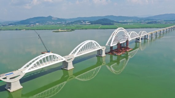 아치교량은 총 5개의 아치 구조물로 구성된다. 가장 큰 아치 양쪽으로 1681t의 아치 2개와 1255t의 아치 2개가 연결됐다. 한강에 설치된 서강대교 아치교와 비슷한 규모다.
