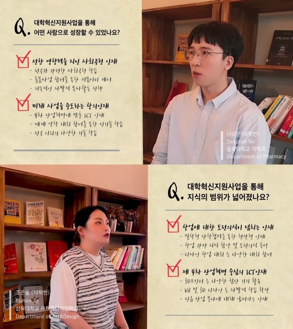 삼육대 팀이 출품한 영상의 제목은 ‘미래를 향한 힘찬 도약’이다. 각각 약학과와 아트앤디자인학과에 재학 중인 두 학생이 대학혁신지원사업을 통해 다양한 도전을 하면서 진로 방향을 수립하고, 각각 ‘사회공헌형 건강과학 인재’와 ‘4차 산업혁명 중심의 ICT 인재’로 성장해나가는 과정을 진솔한 인터뷰 형식으로 풀어냈다.