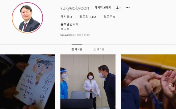 윤 전 총장은 이날 오후 자신의 인스타그램에 3장의 사진을 게시했다.