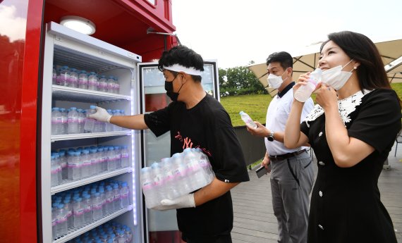 21일 노원구 불암산 나비정원에 설치된 힐링 냉장고에서 시민들이 시원한 생수를 꺼내고 있다.
