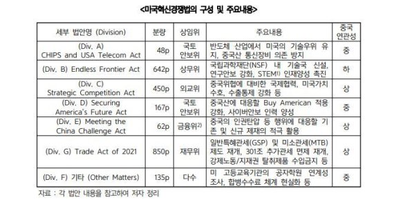미국혁신경쟁법은 중국과의 과학기술 격차 유지와 미중무역분쟁 장기화 대비라는 두 가지 목표를 달성하기 위해 7개의 세부 법안으로 구성됐다.