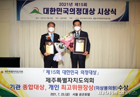 [제주=좌승훈 기자] 제주도의회가 23일 한국공공자치연구원이 주관한 '제15회 대한민국 의정대상'에서 기관 부문 종합대상을 수상했다. 시상식은 이날 오후 서울 공군호텔에서 열렸다.