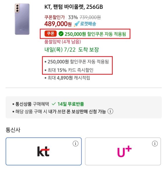 공시지원금 기준으로 소비자는 출고가 119만9000원 짜리 '갤럭시 S21+'를 기기할인 40만원과 최대 추가 지원금 6만원을 받아 할부원금 73만9000원에 개통할 수 있다. 그런데 쿠팡의 로켓모바일에선 25만원 쿠폰 할인 자동 적용과 카드 즉시 할인 7만3350원을 받아 할부원금 41만5650원에 구매할 수 있다.