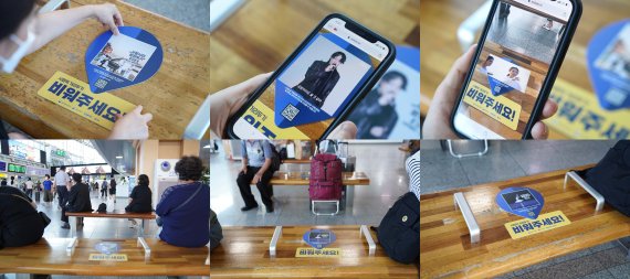 이번 캠페인에서는 기차역 맞이방 의자에 한 칸씩 띄어 앉도록 유도하기 위해 새롭게 디자인한 ‘비워주세요’ 스티커를 부착하고, 스티커에 증강현실 공연을 볼 수 있는 QR코드를 넣었다.