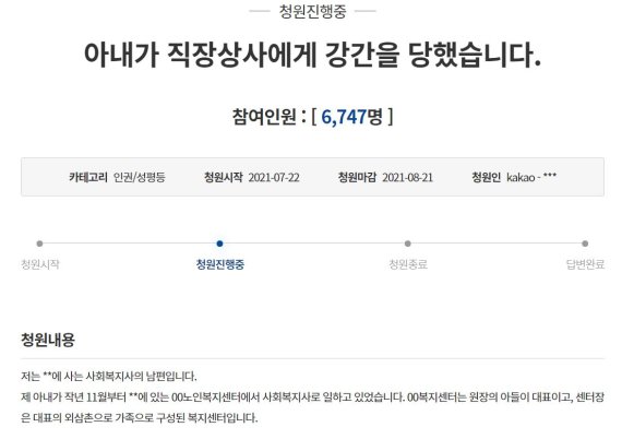 [서울=뉴시스] 김진아 기자 = 노인복지센터에서 사회복지사로 일하는 아내가 직장 상사로부터 성폭력을 당했다는 청와대 청원이 논란을 빚고 있는 가운데 "여성과 남성이 불륜관계였다"는 주장이 제기됐다.