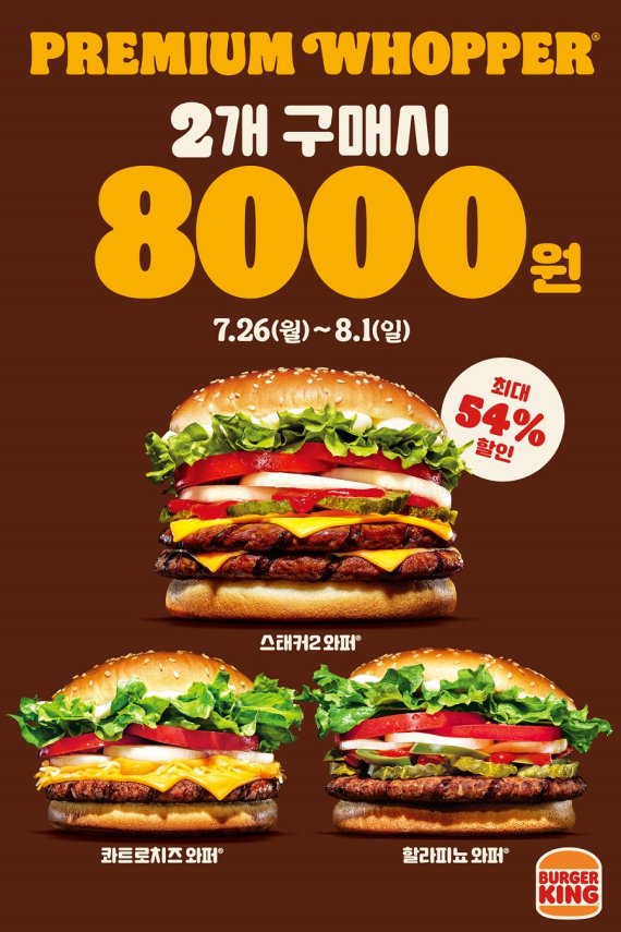해당 프로모션이 적용되는 메뉴는 '스태커2와퍼', '콰트로치즈와퍼', '할라피뇨와퍼' 3종이다. 선택하는 메뉴에 따라 최대 54% 할인 혜택을 받을 수 있다.