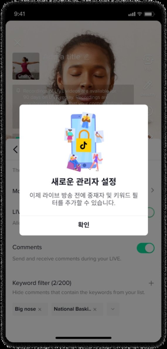 라이브 도중 발생할 수 있는 악성댓글(악플)을 사전 방지하기 위한 기능도 추가됐다. 라이브 진행자는 라이브 론칭 스크린에 있는 설정 탭을 활용해 댓글창을 끌 수 있다. 틱톡은 '키워드 필터'를 통해 진행자가 최대 200개의 키워드를 추가할 수 있게 했다. 방송 진행자는 라이브 채팅 내 관련 단어들을 숨길 수 있어 깨끗한 채팅 환경을 제공할 수 있게 됐다.