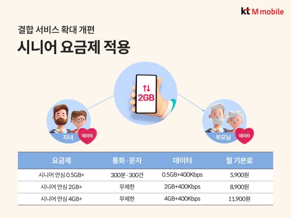 먼저 고령층 부모와 결합을 원하는 가입자들의 의견을 반영, 만 65세 이상 고객만 가입이 가능한 시니어 전용 무제한 요금제 △시니어 안심 0.5GB+(월 5900원) △시니어 안심 2GB+(월 8900원) △시니어 안심 4GB+(월 1만1900원) 3종을 ‘데이터 받기 전용’ 상품에 추가했다.