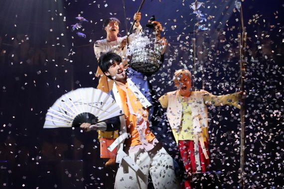 [서울=뉴시스]박진희 기자 = 국립정동극장이 레퍼토리 뮤지컬 '판'을 3년만에 재공연한다. 19세기 조선 후기를 배경으로 양반가 자제 '달수'가 소설을 읽어주고 돈을 버는 전기수(傳奇叟) '호태'를 만나 최고의 이야기꾼이 되어가는 과정을 정통 연희 양식과 서양 음악으로 구성해 사회상을 그리고 있다. 여기에 주체적인 여성 매설방(전기수가 활동하는 이야기방) 주인 '춘섬'과 전기수가 읽어주는 소설을 필사하는 '이덕'이 등장해 극을 이끌어간다. 110분간 이어지는 '판'은 그야말로 무더위를 날릴 신명나는 무대로 어깨춤이 절로 난다. 민속인형극 '꼭두각시놀음'을 통한 풍자가 깊게 스며있는 뮤지컬 '판' 주요 장면을 사진과 대사(가사)를 통해 상상을 자극할 '판' 속으로 들어가 보자. 공연은 9월5일까지 열린다.