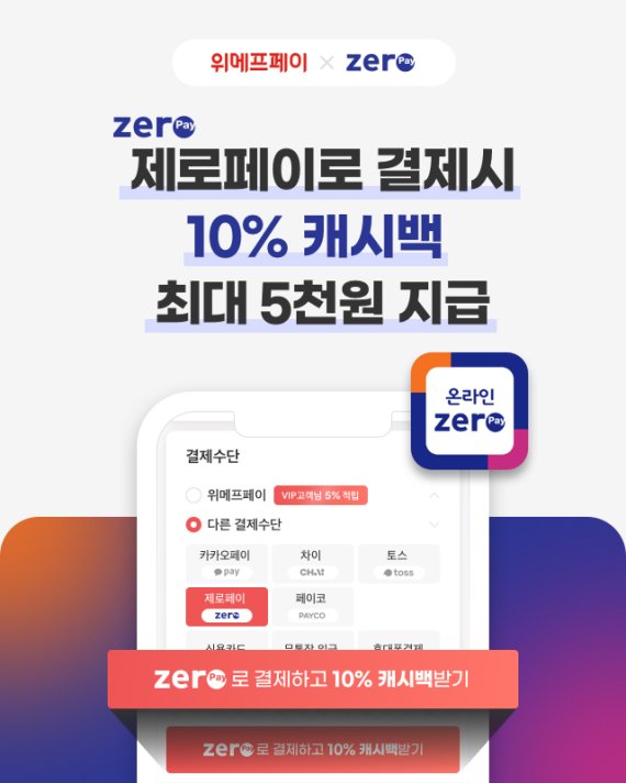 위메프는 온라인 제로페이 론칭을 기념해 온라인 제로페이 이용자에게 결제 금액의 10%를 캐시백으로 돌려준다. 행사 기간 선착순으로 최대 5000원까지 중복 캐시백 혜택을 제공한다.