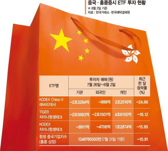 반대로 개인은 최근 6거래일간 기관과 외국인이 내다판 이들 ETF를 사들였다. KODEX China H 레버리지(H) 2조2516억원, TIGER 차이나항셍테크 4조6150억원 등이다. 특히 개인은 지난 7월 26~27일 이틀간 TIGER 차이나항셍테크를 하루에 50억원어치씩 사들였다. 이 ETF가 지난해 12월 16일 상장한 이래 일별 최대 순매수 규모다.