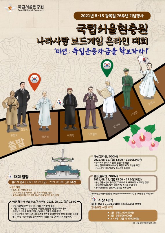 '나라사랑 보드게임 온라인 대회'는 독립운동가 활동을 주제로 제작한 보드게임이다. 1등 100만원, 2등 50만원, 3·4등 각 30만원과 현충원장상을 수여한다.