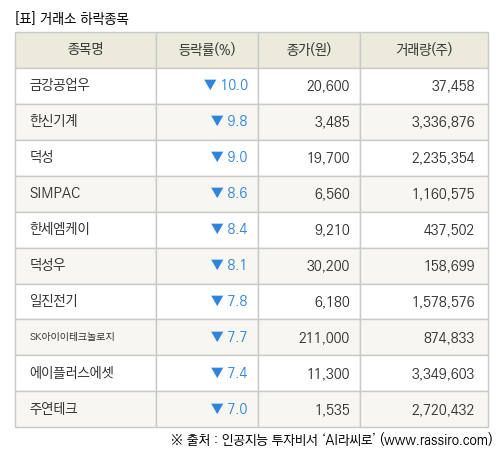 [fnRASSI]장마감, 거래소 하락 종목(금강공업우 -10.0% ↓)