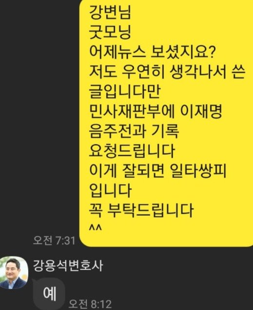 김씨로부터 문자 부탁을 받은 강용석 변호사는 "예"라고 답변, 이재명 음주운전 논란에 참전했다.