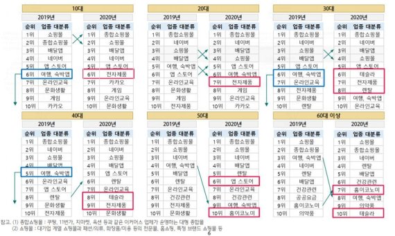 코로나 19 사태 여파로 여행, 숙박 분야는 전 연령층에서 순위가 크게 하락하거나 10대 항목에서 사라졌다. 다만 20대는 국내 여행 등으로 전환했을 뿐 수요는 꾸준했던 것으로 파악된다. 반면 재택근무 등의 증가로 인해 전기·전자제품의 경우 40대 이하 모든 연령층에서 순위가 상승했다. 또한 거리두기 여파로 20~50대 전연령층의 음식 배달앱 결제규모 순위도 상승세를 보였다.