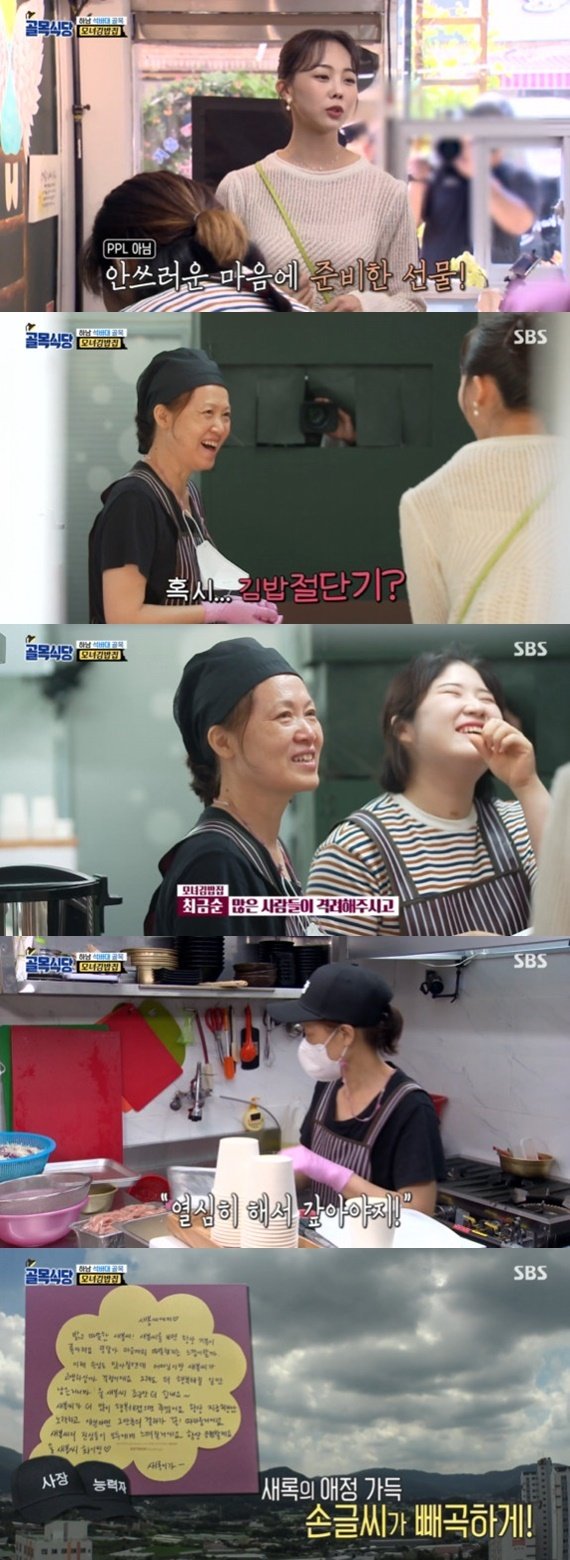 금새록이 모녀김밥집에 깜짝 선물을 전달했다. 지난주 90줄 김밥 말기 미션으로 힘겨웠던 모녀를 위해 '골목식당' 측에서 김밥절단기를 선물했던 것. 사장님은 "딸이 가장 갖고 싶어 하던 건데"라고 놀라며 "너무 많은 사람들이 격려해주고 정말 감사하다"라며 눈시울을 붉혔다.
