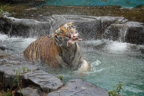 우선 더위에 약한 시베리아 호랑이에게는 수영장에 커다란 얼음을 띄워 물 온도를 낮추고 생닭을 던져 수영을 유도한다.