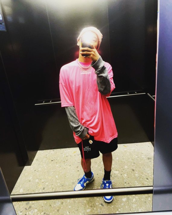 공개된 사진 속에는 지드래곤이 엘리베이터(승강기) 안에서 셀카를 찍고 있는 모습이 담겼다. 휴대폰과 불빛으로 얼굴을 가린 그는 핑크색 티셔츠에 반바지를 입고 모자를 쓴 패션을 선보였다.