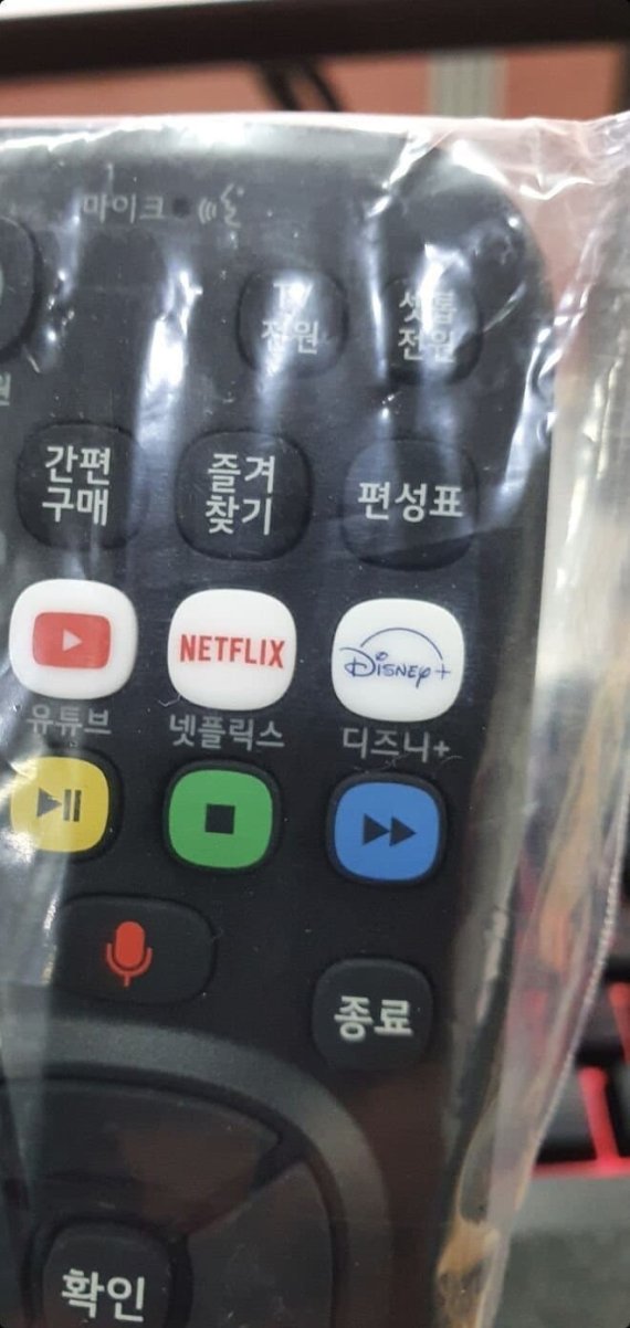 9일 업계에 따르면 LG헬로비전의 리모컨에 디즈니+의 버튼이 추가된 신형 리모컨의 실물 사진이 유출됐다. 해당 리모컨은 LG헬로비전에서 지난 1월 선보인 헬로tv 셋탑박스의 리모컨과 동일한 디자인이다.