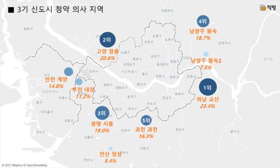 9일 부동산 플랫폼 직방이 어플리케이션 이용자 1377명을 대상으로 한 설문조사 결과, 3기 신도시 중 청약 의사가 가장 높은 지역은 '하남 교산(23.4%)'로 조사됐다. 이어 △고양 창릉(20.6%) △광명 시흥(19.0%) △남양주 왕숙(18.7%) △과천 과천(16.3%) △인천 계양(14.8%) △부천 대장(11.2%) △남양주 왕숙2(7.5%) △안산 장상(5.4%) 순으로 나타났다.