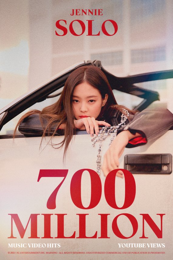 9일 소속사 YG엔터테인먼트에 따르면 제니의 솔로곡 '솔로'(SOLO) 뮤직비디오는 이날 오후 3시50분께 유튜브에서 7억뷰를 돌파했다. 지난 2018년 11월12일 공개된 지 약 2년 9개월 만이다.