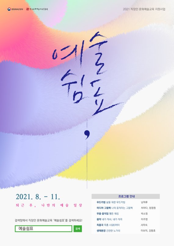 교육진흥원 관계자는 "예술로 삶의 회복과 활력을 되찾고 일과 삶의 균형을 누리고자 하는 동시대 직장인들을 위해 기획한 프로그램이다. 나와 우리들이 함께 하는 충만감 있는 여가와 문화생활에 주목할 수 있는 시간이 될 것"이라며 "온라인으로 진행하는 만큼 평소 시공간적 제약 때문에 문화예술교육 참여가 어려웠던 분들을 포함한 많은 분들의 관심 부탁드린다"고 전했다.