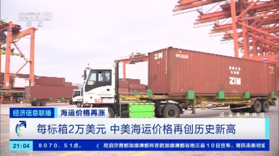 이런 가운데 중국과 동남아시아에서 북미 동해안까지 컨테이너 운임이 처음으로 TEU(길이 20ft의 컨테이너 박스 1개)당 2만달러를 돌파했다고 CCTV가 보도했다.