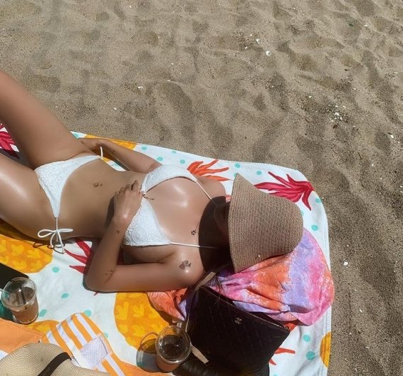 하얀색 비키니를 입고 몸에는 오일을 바른 채 모래사장에 누워 선탠 중인 모습이다.