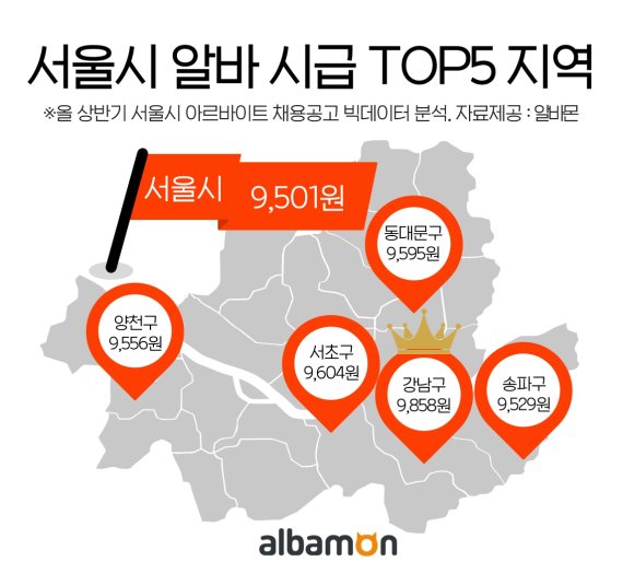 알바몬 조사, 강남구 알바 평균 시급 9858원으로 서울시 1위