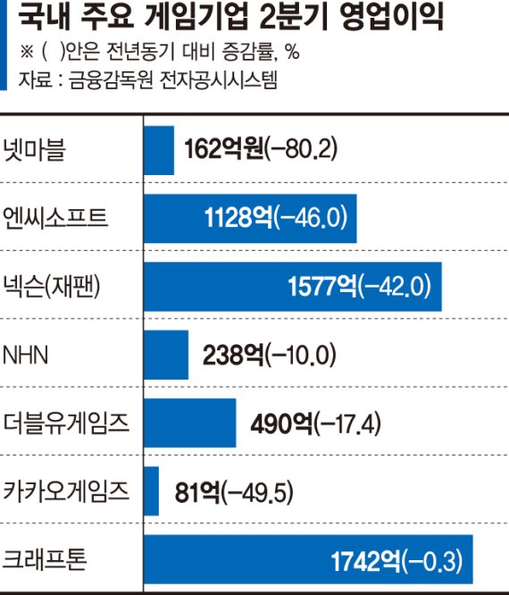 금융감독원에 따르면 국내 대표 게임기업 '3N'(넥슨, 엔씨소프트, 넷마블)은 2·4분기 실적에서 일제히 '어닝 쇼크'(실적 충격)를 기록했다. 일본에 상장된 넥슨의 2·4분기 매출액과 영업이익이 전년 동기 대비 13%, 42%씩 급감했고 넷마블의 2·4분기 영업이익은 162억원으로 1년전에 비해 80.2% 급감했다.