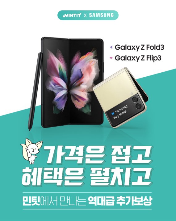 16일 민팃(MINTIT)은 최근 삼성전자가 선보인 ‘갤럭시 Z 폴드3’, ‘갤럭시 Z 플립3’ 구매 고객을 대상으로 기존 사용 휴대폰에 대한 추가 보상 프로그램을 운영한다고 밝혔다. 9월말 이전 대상 신규 스마트폰을 구매∙수취한 후 14일 이내 중고폰을 반납하면 민팃 시세에 더해 기기 모델별 특별 보상을 하는 것이다.