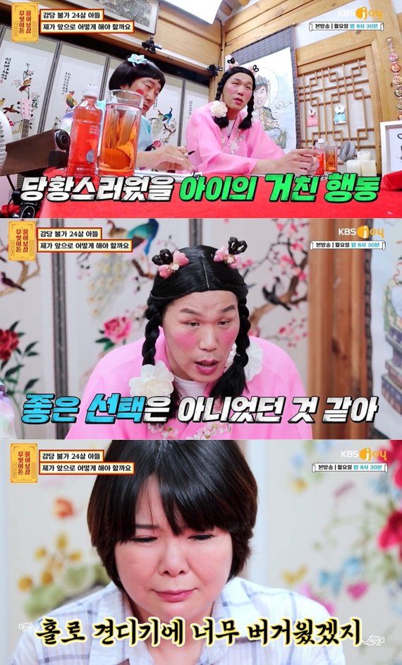 지난 16일 방송된 KBS JOY 예능프로그램 '무엇이든 물어보살'에서는 고등학교 3학년 때 낳은 24세 아들과의 문제로 고민하는 의뢰인으로 출연했다.
