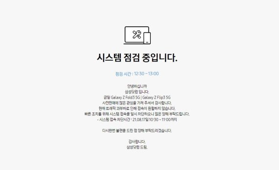 삼성전자 측은 "현재 트래픽 과부하로 인해 접속이 원활하지 않다"며 시스템 접속을 일시 차단하고 오전 11시까지 점검을 진행한다고 공지했다. 해당 시스템 점검은 공지한 시간을 15분 넘긴 11시15분까지 연장한 끝에 종료됐다.