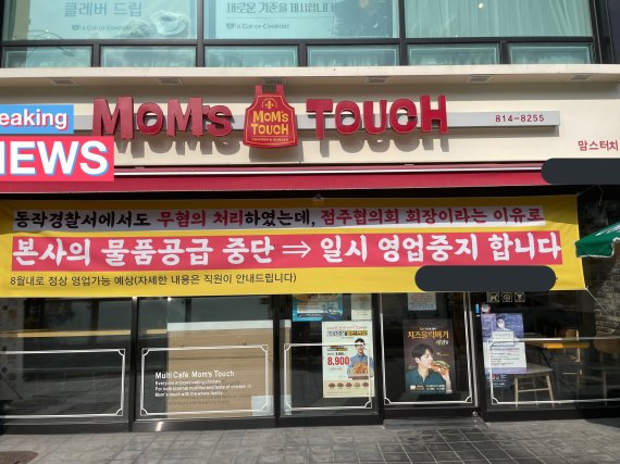 사진 속 맘스터치 상도역점에는 “동작경찰서에서도 무혐의 처리했는데, 점주협의회 회장이라는 이유로 본사의 물품공급 중단, 일시 영업중지합니다”라는 현수막이 걸려 있다.
