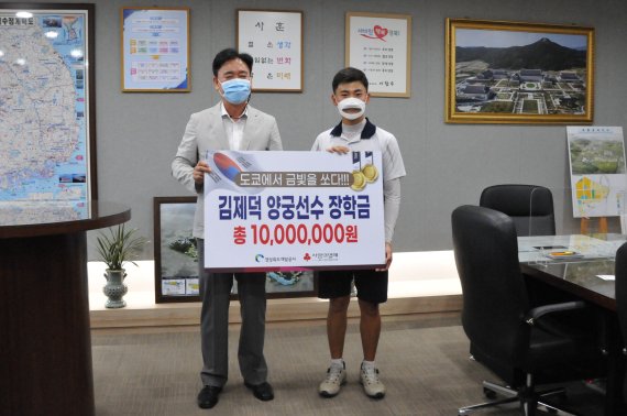 [안동=뉴시스] 경북개발공사 양정배 전무이사가 17일 공사에서 김제덕 선수에게 장학금을 전달하고 있다. (사진=경북개발공사 제공) 2021.08.17 *재판매 및 DB 금지 [안동=뉴시스] 류상현 기자 = 경북도개발공사가 도쿄 올림픽 양궁 혼성 단체및 남자 단체에서 금메달 2개를 수확한 경북 예천출신 김제덕(17·경북일고) 선수에게 장학금 1000만원을 지원했다.
