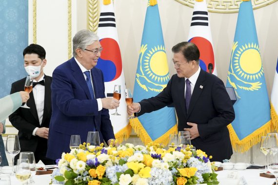 문 대통령은 이날 오후 청와대 영빈관에서 국민 만찬을 개최하고 토카예프 대통령과 국정철학, 코로나19 대응, 문화 교류 등 상호 관심사에 대해 폭넓은 의견을 나눴다.