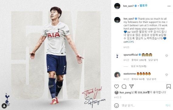 손흥민은 게시글에서 "500만 팔로워 너무 감사드립니다. 앞으로 많은 응원과 성원에 보답할 수 있도록 열심히 노력하겠습니다"라고 한글과 영어로 썼다.