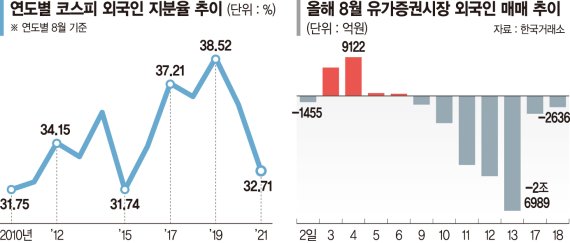 하인환 KB증권 연구원은 "코스피에서 외국인 지분율은 31% 선이 중요 분기점으로 작용하고 있다"면서 "순매수 전환 시점은 올해 3분기 말에서 4분기 초가 될 가능성이 높다"고 말했다.