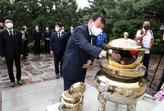 윤 전 총장은 18일 고(故) 김대중 전 대통령 서거 12주기를 맞아 국립 서울현충원에 있는 DJ 묘역을 참배했다. 국민의힘 대권주자 가운데 김 전 대통령 묘역을 찾은 것은 윤 전 총장이 처음이다.