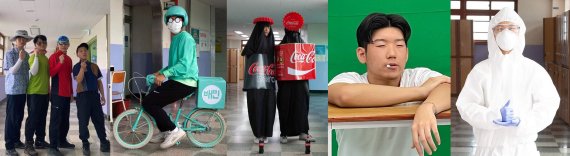 [의정부=뉴시스] 의정부고등학교 학생자치회가 공개한 졸업사진. 왼쪽부터 한사랑산악회, 배달의민족, 코카콜라, 야구선수 강백호, 코로나19 의료진 모습을 연출하고 있다. (사진=의정부고 학생자치회 제공) [서울=뉴시스]류현주 기자 = 매년 기발한 패러디로 졸업 사진을 찍는 의정부고등학교 3학년 학생들의 졸업 사진이 공개됐다.