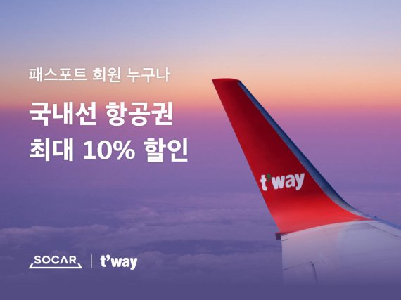 국내 모빌리티 기업 쏘카는 패스포트 이용자라면 누구나 티웨이 국내선 항공권을 10% 할인받을 수 있는 혜택이 추가됐다고 20일 밝혔다. 단 연말연시 등 일부 기간은 제외된다.