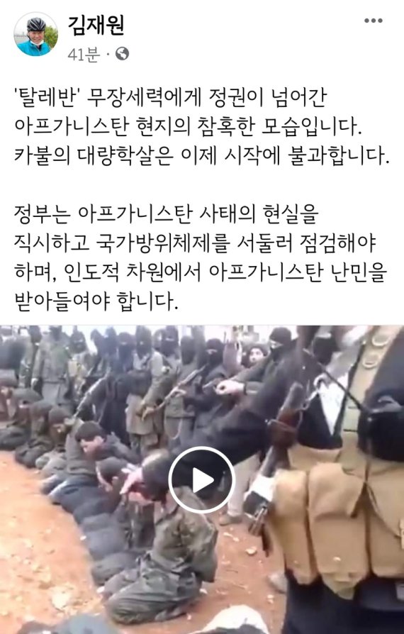 그는 "탈레반 무장 세력에 정권이 넘어간 아프가니스탄 현지의 참혹한 모습"이라며 "카불의 대량학살은 이제 시작에 불과하다"고 했다.