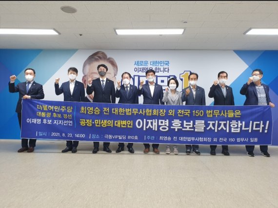 최영승 전 대한법무사협회장 등 150여명의 법무사들은 이날 오후 2시 여의도에 위치한 이재명 더불어민주당 대통령선거 경선후보 열린캠프에서 이 지사에 대한 지지 입장을 밝혔다.