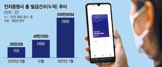 현재 전자증명서로 발급 가능한 서류는 주민등록등·초본, 건강보험자격득실확인서, 소득금액증명 등 100종이다. 총 발급건수는 지난 7월말(누적) 기준 약 110만건. 이 중 주민등록등·초본(발급비율 58%)이 절반을 넘는다.
