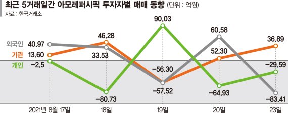 23일 한국거래소에 따르면 기관 투자자들은 지난 20일과 이날 아모레퍼시픽을 42억원어치를 사들였다. 연기금 등은 지난 13일부터 단 하루를 제외하고 연속 매수 우위를 유지하고 있다.