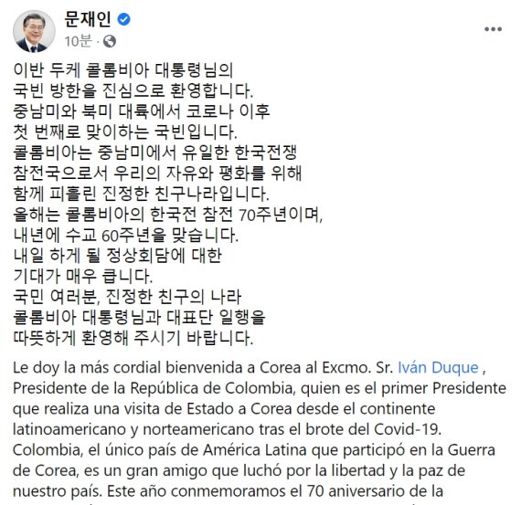 문 대통령은 이날 사회관계망서비스(SNS)에 올린 글을 통해 "이반 두케 콜롬비아 대통령님의 국빈 방한을 진심으로 환영한다"며 "중남미와 북미 대륙에서 코로나 이후 첫 번째로 맞이하는 국빈"이라고 밝혔다.