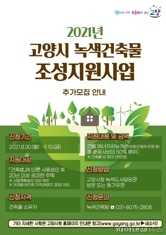 【파이낸셜뉴스 고양=강근주 기자】 고양시가 노후주택 에너지효율 향상과 주거환경 개선을 위해 ‘2021년 녹색건축물 조성 지원사업’ 대상을 오는 9월10일까지 추가 모집한다.