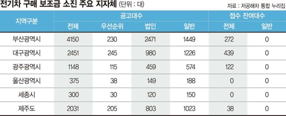 광역시중에서는 부산, 대구, 광주, 울산에서 일반 구매자들에게 배정된 보조금이 소진됐다. 부산이 1449대, 대구 1226대, 광주 574대, 울산 188대의 전기차 구매보조금을 배정했지만 4개 광역시 모두 배정물량 이상의 신청이 접수됐다.